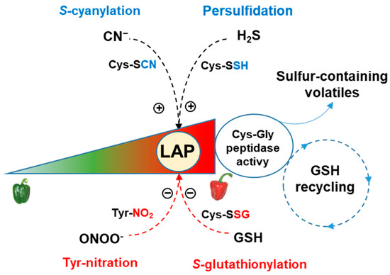 Simple working model of the potential function of the LAP from pepper fruits in the mechanism of the GSH recycling process through its Cys–Gly peptidase activity and generation of sulfur-containing volatiles. During pepper fruit ripening, LAP activity is positively regulated by H2S (persulfidation) and cyanide (S-cyanylation), but it is negatively regulated by tyrosine nitration and S-glutathionylation. Based on our previous model [31].