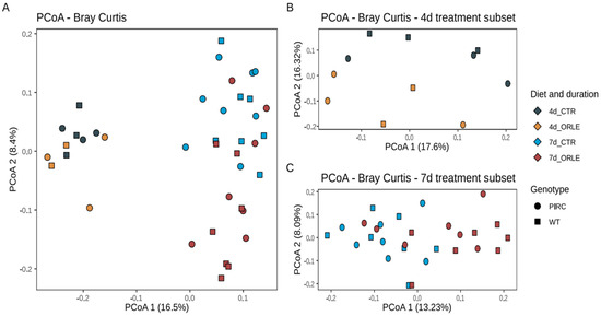 PCoA ordinations based on Bray–Curtis dissimilarity index. (A) Ordination of all samples after 4 and 7 days of ORLE treatment in PIRC and WT genotypes. (B,C) PCoA ordinations based on the Bray–Curtis dissimilarity index considering subsets of 4 and 7 days of ORLE treatment, respectively. The shape of the points indicates the sample genotype: squares for WT, circles for PIRC. The colour of the points represents different experimental conditions considering the treatment (CTR or ORLE) and the duration (4 or 7 days).