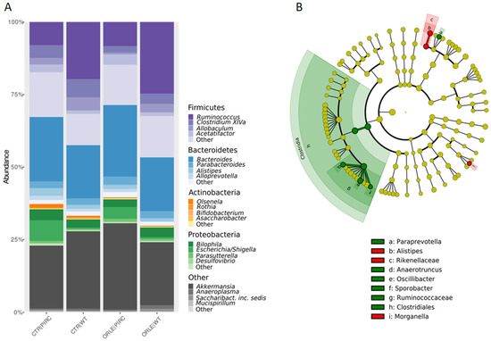 (A) Relative abundances of phyla and genera (only phyla and genera with abundance > 5% in at least one sample were represented). Composition of bacterial communities at the phylum level, grouped for sample type (CTR vs. ORLE) and genotype (PIRC vs. WT). (B) LEfSe on faecal bacterial communities. The cladogram shows the most discriminative bacterial clades after ORLE treatment. The coloured regions/branches indicate differences in the bacterial population structure between the different groups (CTR in red and ORLE in green). Statistically significant taxa enrichment among groups was obtained with Kruskal–Wallis test among classes (alpha = 0.05). The threshold for the logarithmic LDA score was 2.0.