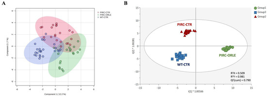sPLS-DA (A) and OPLS-DA (B) score plots showing the modifications of the metabolomic profile of plasma samples belonging to Group 1 (PIRC-ORLE group, in green), Group 2 (PIRC-CTR group, in red), and Group 3 (WT-CTR group, in blue). t1 = latent vector 1; t2 = latent vector 2.