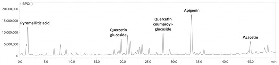 The phytochemical analysis of Halodule uninervis was conducted using HPLC-PDA-MS/MS. A SHIMADZU LC-MS 8050 (Shimadzu, Japan) LC system equipped with a triple quadruple spectrometer with an ESI source was used. Separation was established using a C18 reversed-phase column (Zorbax Eclipse XDB-C18, rapid resolution, 4.6 × 150 mm, 3.5 µm, Agilent, Santa Clara, CA, USA). Water and acetonitrile (ACN) (0.1% formic acid each) gradients were applied, starting from 5% to 45% ACN over 45 min and then reaching 60% over the last 5 min, with a flow rate of 1 mL/min. An automatic injection of 10 μL of the sample, at a concentration of 10 mg/mL, was performed using the SIL-40C xs autosampler. LC solution 5.109 software (Shimadzu, Kyoto, Japan) was used for instrument control, and the MS operated in negative ion mode. The m/z range for MS data acquisition was 100 m/z to 1500 m/z, using collision energies of 35 eV and 45 eV. Compound identification was achieved by comparing molecular weights, mass fragmentation patterns, and elution orders with those documented in the literature for the plant and genus, as well as with in-house standards [26].