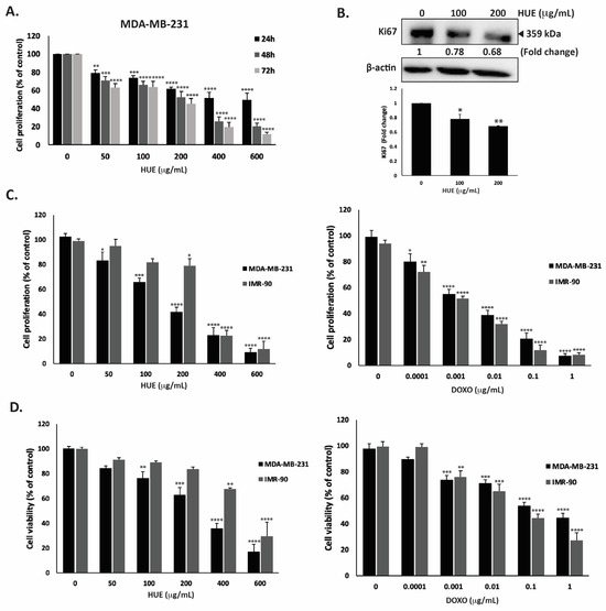The selectivity of HUE was evaluated by testing its effect on normal human fibroblast cells (IMR-90) and comparing it to the commonly used anti-proliferative drug doxorubicin (DOXO). Our results showed that HUE displays some selectivity against MDA-MB-231 cells over IMR-90 cells, with IC50 values of 157.02 μg/mL and 290.05 μg/mL, respectively (Figure 3C). It is worth mentioning that DOXO did not display any selective anti-proliferative effect, with IC50 values of 2.5 ng/mL and 1.3 ng/mL for MDA-MB-231 and IMR-90 cells, respectively (Figure 3C).