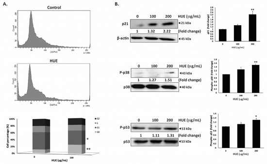 P53 is a well-known tumor suppressor that regulates cell cycle by activating p21 [30]. To further investigate the molecular signaling behind HUE-induced cell cycle arrest, the protein levels of phosphorylated p53 were assessed. HUE treatment increased the levels of phosphorylated p53 in a concentration-dependent manner, achieving a significant increase at 200 μg/mL (1.31 ± 0.07-fold change in the control) (Figure 4B). Altogether, these data suggest that the activation of p38 and p53 by HUE could induce cell cycle arrest by regulating p21 activity.