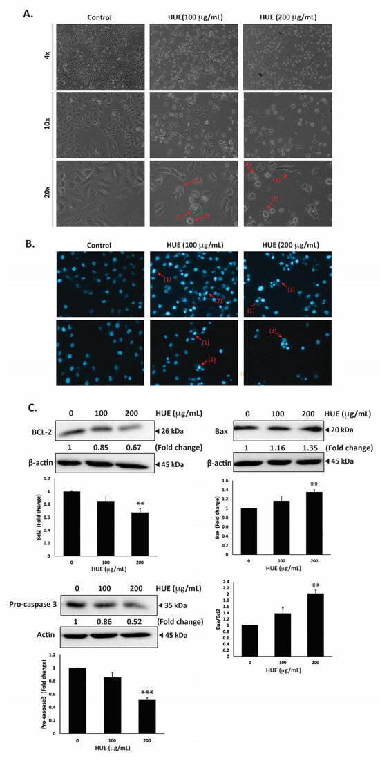 Halodule uninervis ethanolic extract induces apoptosis in MDA-MB-231 cells. (A) MDA-MB-231 cells were treated either with vehicle-containing control or HUE (100 or 200 μg/mL) for 24 h. Cellular morphological changes were detected via light optical microscopy. Arrows indicate (1) apoptotic bodies, (2) echinoid spikes, (3) membrane blebbing, and (4) cell shrinkage. (B) Cells were treated either with vehicle-containing control or HUE (100 or 200 μg/mL) for 24 h and stained with DAPI to visualize nuclear morphological changes via fluorescence microscopy. Pictures were taken at 10× magnification. Arrows show (1) chromatin lysis, (2) nuclear condensation, and (3) apoptotic bodies. (C) Cells were treated either with vehicle-containing control or HUE (100 or 200 μg/mL). Protein levels of procaspase 3, Bcl2, and Bax were determined via Western blotting. β-actin was used as a loading control. Data represent the mean ± SEM of three independent experiments (n = 3). (** denotes p < 0.005, and *** p < 0.001).