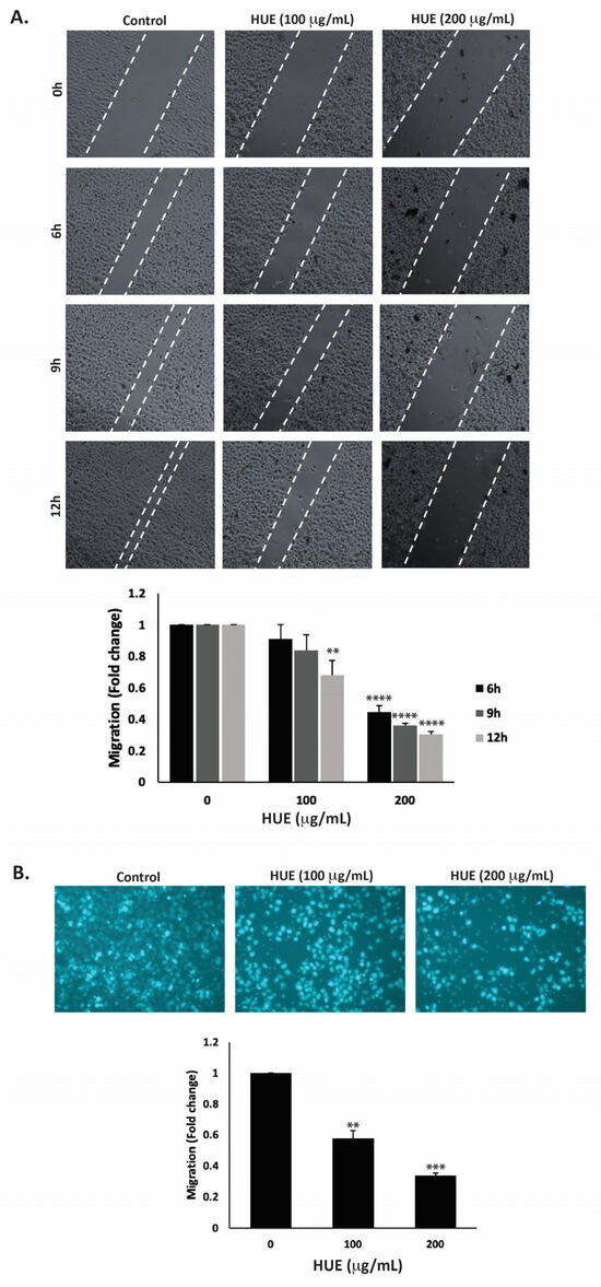 Cell migration is a crucial mechanism in many physiological processes such as immune responses, tissue formation, and wound healing. However, aberrant cell migration contributes to cancer metastasis, where tumor cells disseminate from the primary tumor site and colonize in other locations. Here, the effect of HUE on the migration of MDA-MB-231 cells was assessed using the wound-healing and trans-well migration assays. Figure 6A indicates that HUE decreased the ability of cells to migrate and cover the scratched area in a concentration- and time-dependent manner.