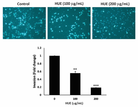 Trans-well inserts (8 μm pore size; BD Biosciences, Bedford, MA, USA) were used to evaluate the migratory abilities of MDA-MB-231 cells. Indeed, 3 × 105 cells were seeded into the upper chamber of the insert. Cells were then treated with or without the indicated concentrations of HUE. DMEM medium supplemented with 10% FBS was used as a chemoattractant in the lower chamber. Cells were then incubated at 37 °C and allowed to migrate for 24 h. Cells that stayed on the upper surface of the insert were removed with a sterile cotton swab. And cells that migrated to the lower surface of the insert were fixed with 4% formaldehyde, stained with DAPI (1 μg/mL), and viewed under a fluorescence microscope at 10× magnification for quantification. The assay was repeated three times, and data are presented as mean values ± SEM.
