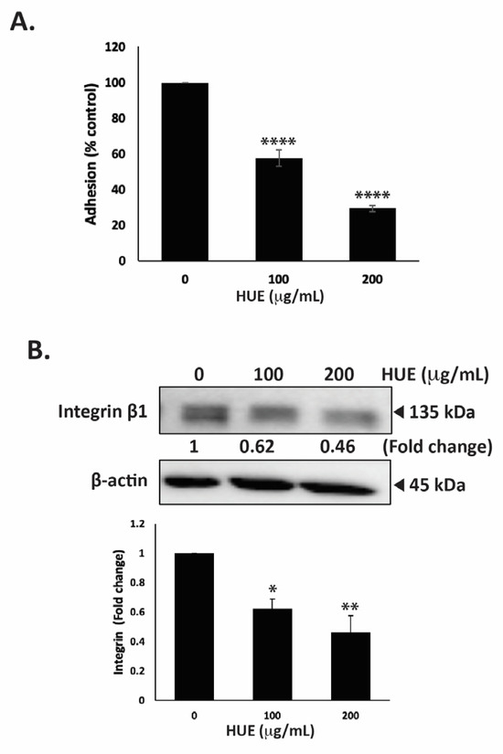 MD-MB-231 cells were cultured either with the vehicle-containing control or the indicated concentrations of HUE for 24 h. The cells were then seeded at a density of 5 × 104 onto a 24-well plate pre-coated with collagen and allowed to adhere for 3 h. Afterwards, the cells were washed with PBS to remove unattached cells, and the number of attached cells was determined using the MTT reduction assay (described above).