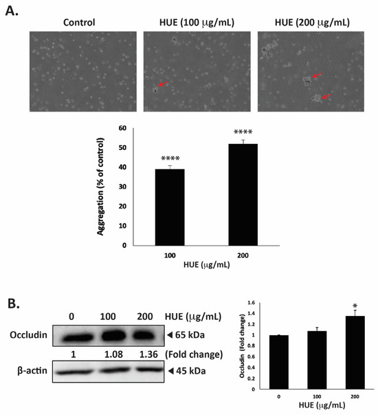 MDA-MB-231 cells were collected from confluent plates using 2 mM EDTA in Ca2+/Mg2+-free PBS. Cells were then seeded on 60 mm plates at a density of 4 × 105 with or without the indicated concentrations of HUE. Cells were incubated at 37 °C on a shaker (90 rpm) for 4 h and then fixed with 1% formaldehyde. Images from a minimum of 5 different fields were taken at 4× magnification, and percentage of aggregation was calculated using the following formula: