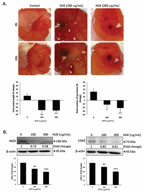 Fertilized chicken eggs were cleaned with 70% ethanol and incubated with rotation at 37 °C with 50% relative humidity. After one week, the highly vascularized chorioallantoic membrane (CAM) was dropped by creating an opening in the eggshell, exposing the air sac. To examine the effect of HUE on blood vessel growth, different concentrations were added onto the CAM and incubated for 24 h. Afterwards, images of the CAM were captured and evaluated using AngioTool 0.5a software to measure the vessels’ lengths and count the number of junctions.