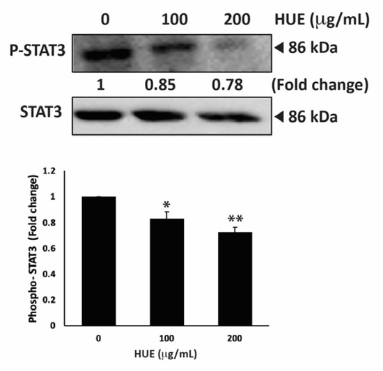 The p38 mitogen-activated protein kinase (MAPK) pathway plays a significant role in the regulation of cell cycle progression and induction of apoptosis [27]. Western blotting analysis of the protein levels of the active phosphorylated form of p38 revealed the concentration-dependent activation of p38 in HUE-treated MDA-MB-231 cells, achieving a significant increase at 200 μg/mL (1.51 ± 0.09-fold change in the control) (Figure 4B). In addition, HUE treatment led to a significant increase in the protein levels of the cell cycle regulator p21, a downstream effector of p38 [28,29] (Figure 4B). These results further confirm the cell cycle data.
