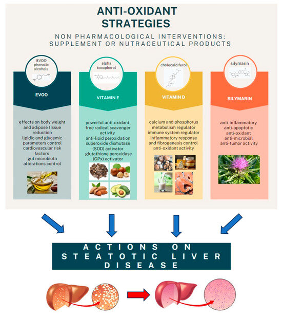 The recent literature is full of studies that focus on non-pharmacological interventions that target oxidative stress in MAFLD treatment. The role of vitamins such as vitamin E and vitamin D, together with silymarin, has been extensively shown to be positive, both in pre-clinical and clinical models. As for the role of EVOO, unfortunately, studies that have specifically analyzed the effects of EVOO or its components on NAFLD/MAFLD have been mostly inconclusive, and thus, it remains difficult to determine a definitive response regarding its effects on liver steatosis. From this point of view, clinical trials designed with rigorous methodology will be necessary to shed more light on this interesting and important topic.