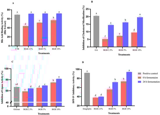 Potential biological activities of BGB beverage at 0 and 24 h of fermentation: The percentage of bile acid binding (A), the inhibition of cholesterol micellization (B), the inhibition of lipase activity (C), and DPP-IV inhibitory activity (D). The results were expressed as mean ± S.E.M. (n = 3). Significant differences are presented with different superscripted letters (p < 0.05). CTR: Cholestyramine; GA: Gallic acid.