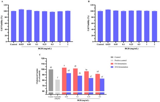 Effect of BGB on Caco-2 cells line: Cell viability after the treatment of cell with BGB at 0 h fermentation (A) and the treatment of cell with BGB at 24 h fermentation (B), and the impact of BGB on cholesterol uptake in Caco-2 cells (C). The results are presented as mean ± SEM (n = 3). Significant differences are presented with different superscripted letters (p < 0.05).