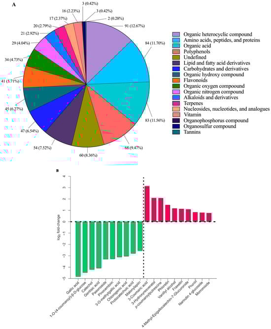 The quantitative distribution of identified metabolites across distinct chemical classes. Different color blocks represent different chemical classifications, the percentage denotes the proportion of metabolites within that classification relative to the overall metabolites. Unassigned metabolites were categorized as undefined (A) and Top 10 phytochemical compounds with the largest fold change. Green and red bars represent upregulated and downregulated metabolites after fermentation, respectively (B).