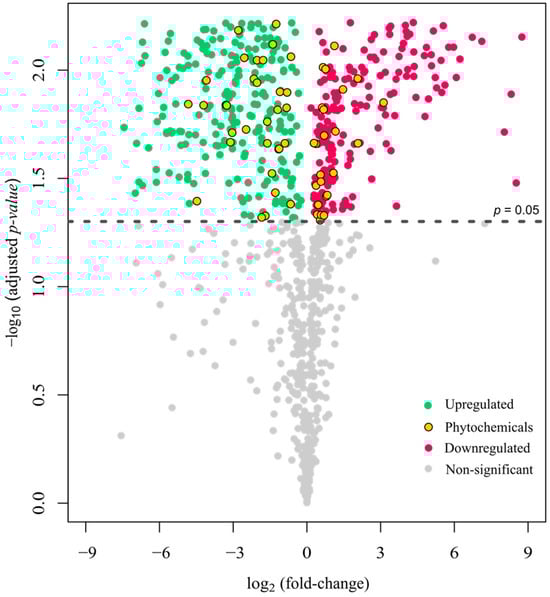 Volcano plot showing log2 fold change and adjusted p-values of metabolite compounds quantified using LC-HRFTMS. Negative log2 fold change indicates the increment of compounds. Green circles represent upregulated metabolites and red circles represent downregulated metabolites after fermentation. Yellow circles represent interested phenolic compounds.