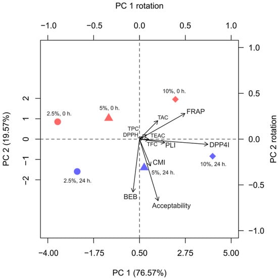 Principal component analysis (PCA) and biplot of BGB samples at 0 and 24 h of fermentation. Principal axes were calculated from 3 groups of parameters: phytochemical, biological, and sensory acceptability. TPC: Total phenolic content; TFC: Total flavonoid content; TAC: Total anthocyanin content; DPPH: DPPH radical scavenging activity; FRAP: Ferric-reducing antioxidant power; TEAC: Trolox equivalent antioxidant capacity; CMI: Cholesterol micellization inhibition; PLI: Pancreatic lipase inhibition; BEB: Bile extract binding; DPP4I: Dipeptidyl peptidase-IV inhibition.