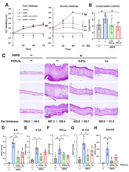 First, we investigated the protective effect of PAPLAL against skin inflammation using an ACD model induced by DNFB (Figure 1). Specifically, DNFB was applied to the ear to induce skin inflammation after sensitizing the mice with DNFB to the abdominal skin. In addition to DNFB sensitization and induction of contact dermatitis in the ears, we applied PAPLAL to the ears and measured changes in ear thickness. During the first challenge, DNFB treatment significantly increased ear thickness compared to that in the control groups, but additional treatment with PAPLAL failed to improve skin inflammation in the ears (Figure 2A). Furthermore, during the second challenge, DNFB treatment increased skin thickness and exacerbated the inflammatory response compared with the first challenge (Figure 2A). Additional application of PAPLAL at a high concentration in the second challenge inhibited hyperplasia of the ear skin, suggesting an inhibitory effect of PAPLAL on ACD (Figure 2A). In addition, the application of PAPLAL at a low concentration also inhibited the increase in skin thickness in the ears 24 h after the second challenge, showing a moderate protective effect on ACD (Figure 2A). Furthermore, we analyzed the content of 8-isoprostane, an oxidative stress marker, in ear tissues treated with or without DNFB and PAPLAL. Treatment with DNFB significantly upregulated the 8-isoprostane content in ear tissues (Figure 2B). Additional treatment with PAPLAL significantly decreased the 8-isoprostane content in ear tissues, indicating that PAPLAL attenuated the oxidative damage induced by DNFB (Figure 2B). Consistent with the histology of the ear tissue, PAPLAL significantly reduced ear thickness, as measured by quantitative measurements (Figure 2C).