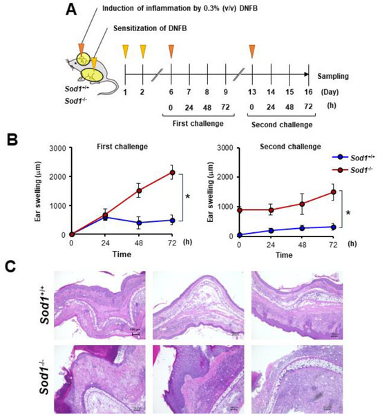Sod1 deficiency deteriorates skin inflammation induced by DNFB. (A) Schematic illustration of the induction of ACD by DNFB in Sod1+/+ and Sod1−/− mice. Abdominal skin of Sod1+/+ and Sod1−/− mice was shaved and sensitized with 50 μL DNFB in acetone/olive oil (4:1, v/v) for days 1 and 2. The mice were topically treated with 20 μL DNFB, which was applied to the surface of the left and right ears on day 6 (first challenge) and day 13 (second challenge). The vehicle group was treated with acetone/olive oil (4:1, v/v). (B) Ear thickness of Sod1+/+ and Sod1−/− mice in the first (left) and second (right) challenge of ACD induced by DNFB. (C) Ear sections were stained with hematoxylin and eosin on day 16. The scale bars represent 100 μm. * p < 0.05. Data are presented as the mean ± SD.