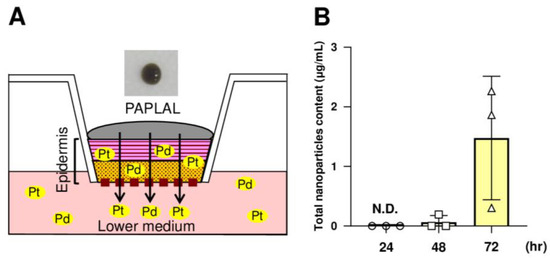 Next, to investigate whether or not the nPt and nPd contained in PAPLAL permeate into the skin, we applied PAPLAL to the human skin epidermal model (Figure 5A). Because PAPLAL is a black color solution (Figure 5A), we first measured the absorbance (450 nm) of the medium. At 24 h after PAPLAL treatment, no nanoparticles were detected in the conditioned medium (Figure 5B). Meanwhile, approximately 1.48 μg of nanoparticles were detected in the lower medium after 72 h PAPLAL, indicating time-dependent skin permeability of PAPLAL (Figure 5B). To further clarify the skin permeability of nPt and nPd, we quantified the amounts of nPt and nPd in the epidermal tissue and lower medium by ICP-MS 72 h after PAPLAL treatment. The epidermal tissue treated with PAPLAL for 72 h contained approximately 2.70 μg and 8.33 μg of nPt and nPd, respectively (Table 2). Furthermore, the lower medium after 72 h of PAPLAL treatment contained approximately 0.04 μg and 0.35 μg of nPt and nPd, respectively (Table 2). The amounts of nPt and nPd that migrated into the lower medium were 0.28% and 0.59% of the amount contained in the PAPLAL, respectively (Table 2). These results suggest that the nPt and nPd contained in PAPLAL penetrate the epidermis and reach the dermal layer.