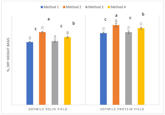 Soymilk solid and protein yields as affected by the four processing methods. Error bars represent standard deviations, while different lower-case letters within each group of soymilk solid and protein yields indicate significance at p < 0.05.