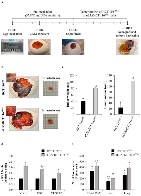 Angiogenic and metastatic potential of uL3∆HCT 116p53−/− cells in Chorioallantoic Membrane (CAM) model. (a) General workflow of in ovo CAM assay. Fertilized eggs were incubated at 37.8 °C. Eggs were opened on egg development day (EDD) four (EDD4). After 5 days, HCT 116p53−/− or uL3∆HCT 116p53−/− cells in Matrigel pellets (3 × 10⁶ tumor cells per pellet) were applied to the CAM, and xenografts were allowed to develop and grow for 8 days. On EDD17, CAM xenografts were harvested, embryos were sacrificed, and chick embryo tissues and xenografts were collected for further processing. (b) Representative macroscopic images of HCT 116p53−/− and uL3∆HCT 116p53−/− cell line-derived tumors on EDD17. (c) Quantification of tumor weight and tumor volume of HCT 116p53−/− and uL3∆HCT 116p53−/− cell-derived tumors is shown. * p < 0.05; ** p < 0.01. (d) Expression of VEGF, FGF and VEGFR2 in the proximal CAM of HCT 116p53−/− and uL3ΔHCT 116p53−/− xenografts was quantified by RT-qPCR using specific primers (Table 1). Bars represent the mean of triplicate experiments; error bars represent the standard deviation. * p < 0.05; ** p < 0.01. (e) qPCR quantification of human HCT 116p53−/− and uL3ΔHCT 116p53−/− cells in the distal CAM, liver and lung tissues using universal human Alu (h-Alu) primers. As internal control used to validate the presence of an equivalent amount of chick genomic DNA (gDNA), we employed chick GAPDH (ch-GAPDH) primers (Table 2). Bars represent the mean of triplicate experiments; error bars represent the standard deviation. * p < 0.05; ** p < 0.01.