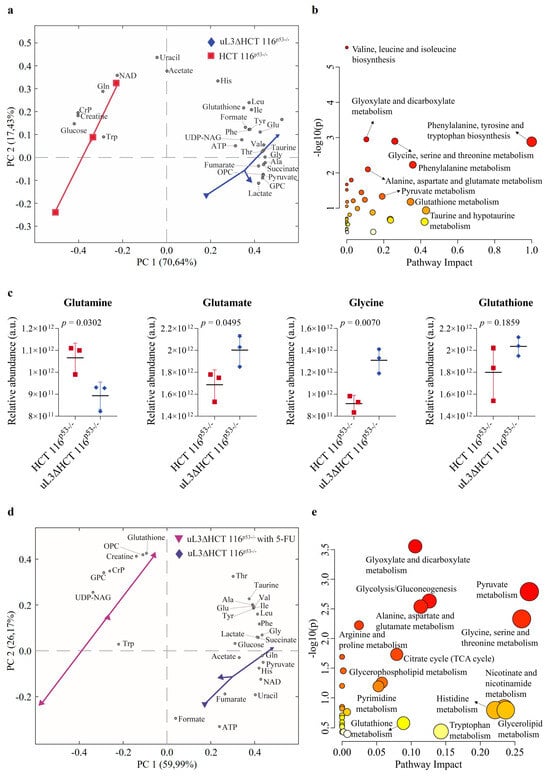 Effect of uL3 silencing on metabolite profiles. Biplot (scores plot combined with loading plot) of principal component analysis (PCA) model derived from the NMR-based metabolomic analyses of uL3ΔHCT 116p53−/− cells vs. HCT 116p53−/−cells (a) or vs. 5-fluorouracil (5-FU)-treated uL3ΔHCT 116p53−/− cells (d), along with their relative pathway analyses, respectively (b,e). Pathway analyses show all matched pathways according to p-values (p) (y-axis) and pathway impact values (x-axis). Circle colors represent p value from yellow (high p) to red (low p). (NAD, Nicotinamide adenine dinucleotide; CrP, Creatine Phosphate; UDP-NAG, Uridine diphosphate N-acetylglucosamine; OPC, O-phosphocholine; GPC, Glycerophosphocholine; TCA, tricarboxylic acid). (c) Bar graphs reporting the NMR-based relative quantification of glutamine, glutamate, glycine, and glutathione in uL3ΔHCT 116p53−/− cells vs. HCT 116p53−/− cells.
