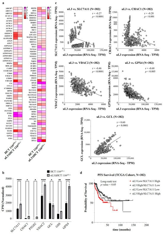 Correlation between uL3 status and the expression of ferroptosis-related genes in colorectal cancer (CRC) cells and patients. (a) The heatmap shows the expression of the ferroptosis-related differentially expressed genes between HCT 116p53−/− and uL3ΔHCT 116p53−/− cells. Pink represents significantly upregulated genes, and red represents significantly downregulated genes in the samples (FDR < 0.25; p < 0.05). (b) Expression analysis of uL3 and ferroptosis-related genes in HCT 116p53−/− and uL3ΔHCT 116p53−/− cells using data retrieved from RNA-Seq. Data were expressed in log-CPM (counts per million). * p < 0.05, ** p < 0.01, **** p < 0.0001. (c) Correlation between uL3 status and the expression of ferroptosis-related genes (SLC7A11, CHAC1, VDAC2, GPX4, GCL) in CRC patients by Spearman’s correlation (p < 0.005). (d) RNA-Seq data retrieved from TCGA database were used to stratify the patients into four groups on basis of uL3 and SLC7A11 expression (median split). PFS analysis demonstrated that patients belonging to the uL3 low/SLC7A11 high expressing group showed significantly shorter PFS (p < 0.05 by long-rank test).