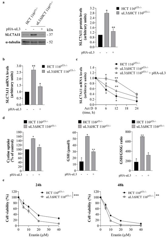 Effect of uL3 silencing on SLC7A11 expression and erastin cytotoxic activity. (a) Protein extracts from HCT 116p53−/− cells and uL3∆HCT 116p53−/− cells transfected or not with pHA-uL3 were analyzed by western blotting (WB) with anti-SLC7A11 antibody; α-tubulin was used as loading control. Full-length blots are shown in Figure S7. The graph shows the relative densitometric analyses, expressed as arbitrary units. Bars represent the mean of triplicate experiments; error bars represent the standard deviation. * p < 0.05, ** p < 0.01 vs. HCT 116p53−/− cells set at 1. (b) RT-qPCR of total RNA extracted from HCT 116p53−/− cells and uL3∆HCT 116p53−/− cells transfected or not with pHA-uL3 using specific primers for SLC7A11 (Table 1). * p < 0.05, ** p < 0.01 vs. HCT 116p53−/− cells set at 1. (c) HCT 116p53−/− cells and uL3∆HCT 116p53−/− cells transfected or not with pHA-uL3 were treated with actinomycin D (Act D) (5 μg/mL). At the indicated time points (0, 6, 12 and 24 h), total RNA was isolated, and mRNA levels of SLC7A11 and β-actin were determined by RT-qPCR by using specific primers (Table 1). The relative amount of SLC7A11 mRNA in untreated cells was set to 1, and the levels of SLC7A11 mRNA in cells treated with Act D were calculated accordingly. * p < 0.05, ** p < 0.01 vs. untreated cells. (d) Evaluation of cystine uptake, reduced glutathione (GSH) levels and GSH/ oxidized glutathione (GSSG) ratio in HCT 116p53−/− cells and uL3∆HCT 116p53−/− cells transfected or not with pHA-uL3 for 24 h. * p < 0.05, ** p < 0.01 vs. HCT 116p53−/− cells. (e) HCT 116p53−/− and uL3∆HCT 116p53−/− cells were treated or not with different concentration of erastin (from 5 to 40 µM) for 24 and 48 h. After incubation, cell viability was evaluated using the MTT assay. Cell viability of untreated cells was set to 100%. Bars represent the mean of triplicate experiments; error bars represent the standard deviation. ** p < 0.01, *** p < 0.001 uL3ΔHCT 116p53−/− cells vs. HCT 116p53−/− cells.