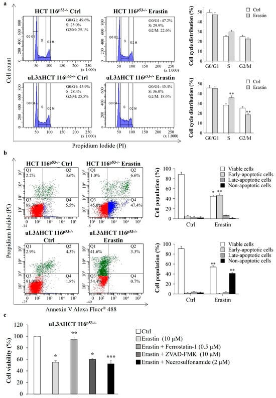 To investigate the underlying mechanism that contributes to erastin-mediated cytotoxicity, alterations in the cell cycle distribution were analyzed. To this end, HCT 116p53−/− and uL3∆HCT 116p53−/− cells were treated with 10 µM of erastin for 24 h. Then, cell cycle distribution was monitored by flow cytometry. As shown in Figure 5a, erastin treatment of HCT 116p53−/− cells did not alter the cell cycle. The exposure of uL3-silenced CRC cells to erastin resulted only in a little accumulation of cells in the S phase of the cell cycle (from about 28.4% to about 36.0%). Accordingly, the number of cells in G2/M phase decreased from 25.5% to 18.6% of the total population (Figure 5a).