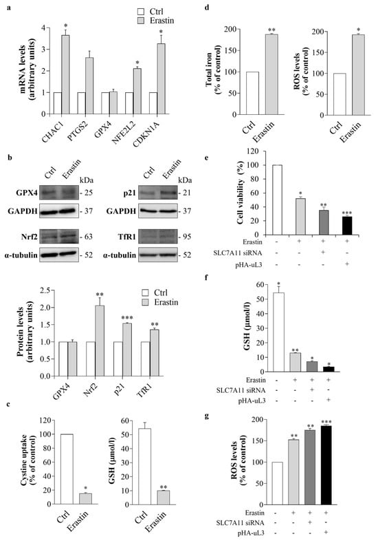 Several compounds have been identified as pharmacological SLC7A11 inhibitors. Among them is erastin, a small molecule that can inhibit SLC7A11 activity, leading to GSH biosynthesis impairment and redox imbalance [21,42]. With the aim of examining the effect of erastin on cell viability, sensitive HCT 116p53−/− cells and resistant uL3∆HCT 116p53−/− cells were treated with different concentrations (from 5 to 40 μM) of erastin. Then, cytotoxicity was assessed by the MTT assay after 24 and 48 h of treatment. According to earlier research [43], HCT 116p53−/− cells showed sensitivity to erastin, and cell viability was decreased in a dose- and time-dependent manner (Figure 4e). Of note, erastin exhibited cytotoxic activity also in resistant uL3∆HCT 116p53−/− cells (Figure 4e).