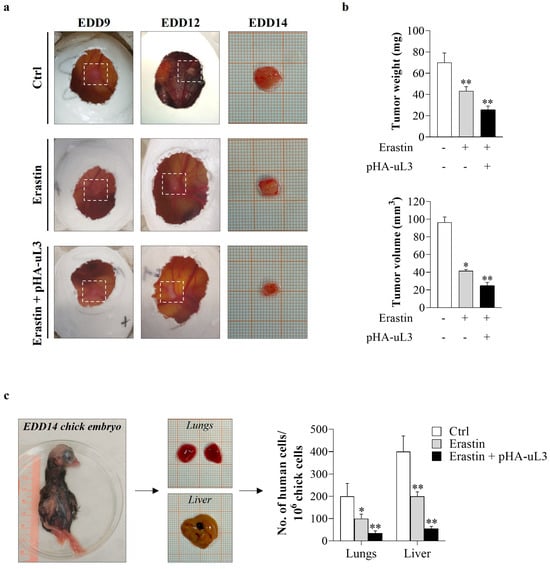 Starting from these notions and our data indicating a negative correlation between uL3 expression and SLC7A11 expression (Figure 3 and Figure 4a–c), we investigated the antiproliferative activity of a combined treatment of erastin plus a plasmid encoding uL3 in uL3-silenced CRC cells. Notably, the combination treatment caused a strong reduction in cell viability compared to erastin alone, associated with a marked decrease in GSH content and an increase in ROS levels (Figure 6e–g). The antiproliferative activity and antimetastatic effects of the combined treatment were also investigated in uL3-silenced CRC cell line-derived tumors in the CAM model. The results showed a substantial decrease in the weight and volume of CAM tumors derived from uL3-silenced CRC cells treated with erastin in combination with uL3 compared to those treated with erastin alone (Figure 7a,b). Metastatic tumor evolution was also analyzed by using quantitative Alu-PCR for the detection and quantification of disseminated human CRC cells in the isolated organs of the chick embryos. We found that the combination therapy resulted in a significant decrease in human cell dissemination compared to treatment with erastin alone (Figure 7c). These data indicate that erastin plus uL3-mediated SLC7A11 inhibition reduced the metastatic capacity of resistant uL3-silenced CRC cells.