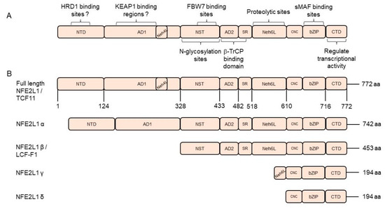 The human NFE2L1 gene is located on chromosome 17q22 [32] and contains nine structural domains based on its sequence characteristics, namely, N-terminal domain (NTD), acidic domain 1 (AD1), asparagine/serine/threonine-rich (NST), acidic domain 2 (AD2), serine repeat (SR), Neh6L, CNC, bZIP, and C-terminal domain (CTD) [9,51]. N-terminal homology box 1 (NHB1) anchors NFE2L1 to the endoplasmic reticulum (ER), while NHB2 is a potential hydrolysis site of NFE2L1 that generates an N-terminal truncated protein form [52] (Figure 1A).
