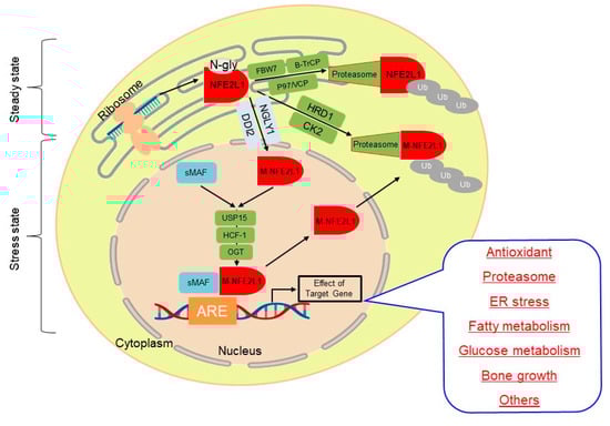 NFE2L1 is regulated at multiple levels, including mRNA transcription and post-translational modification. NFE2L1 is initially an ER-localized protein, consisting of a C-terminus located in the ER lumen and a small N-terminal portion protruding into the cytoplasm [61,62,63]. As shown in Figure 2, in the ER lumen, NFE2L1 undergoes N-glycosylation [52,58,62,64]. Under steady-state conditions, NFE2L1 undergoes ER-associated degradation (ERAD), a pathway specifically designed to degrade misfolded ER proteins [65]. This process involves E3 ubiquitin ligase and homohexamer AAA-ATPase p97 (also known as valerian-containing casein, VCP) [63,66]. When the cells are exposed to ER stress, including proteasome inhibitors treatments, the C-terminal of NFE2L1 is translocated from ER lumen to the cytoplasm via p97/VCP and then de-glycosylated by NGLY1 [67,68]. After de-glycosylation, NFE2L1 is cleaved by DNA damage inducible 1 homolog 2 (DDI2), and the processed NFE2L1 and sMAF form heterodimers that bind to ARE sequences and promote specific downstream target gene expression [39,40,41,69]. During the ER-to-nuclear translocation of NFE2L1, a portion of its deglycoprotein is subject to ubiquitination by an ER membrane-bound E3 ligase HRD1 (also called synoviolin) and subsequent deubiquitination by ubiquitin-specific proteases (USPs) before being degraded by 26S proteasomes [70].