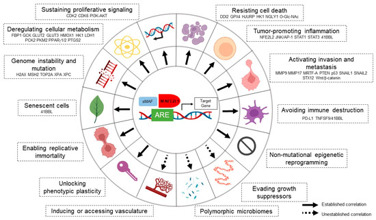 NFE2L1 regulated the hallmarks of cancer. NFE2L1 associates with cancer hallmarks traits through various biological features. The hallmarks with dashed arrow indicate the lack of scientific evidence. The illustration was regrated based on an updated review by Hanahan et al. [29].