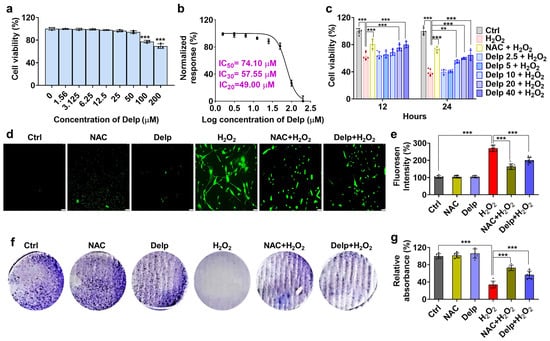The hNPCs were cultured in 96-well plates at 1 × 104 cells/well with 150 µL of NPCM in the presence of various doses of Delp (0 to 200 µM) at 24 h to determine the IC50 value of Delp. Cell viability was measured by the CCK-8 assay and crystal violet assay. The hNPCs were cultured in 96-well plates with 150 µL of NPCM in the presence of various doses of Delp (0, 2.5, 5, 10, 20, and 40 µM) or 5 mM of N-acetyl cysteine (NAC) at 12 and 24 h before 185 µM of H2O2 was added to determine the dose- and time-dependent effects of Delp. The hNPCs (700 cells) were cultured in 6-well plates with 1.5 mL of NPCM supplemented with 40 µM of Delp or 5 mM of NAC for 24 h before 185 µM of H2O2 was added for 24 h, followed by 7 days of recovery. Clonogenicity was determined by crystal violet staining assay.