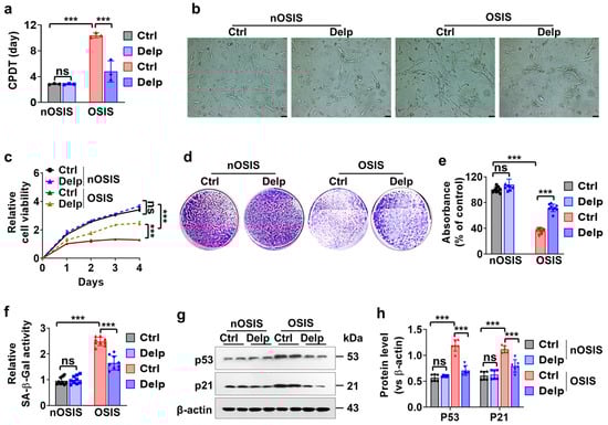 We established an H2O2-induced oxidative stress-induced senescence (OSIS) model, which could serve as a valuable tool for comprehending the impact of Delp on cell growth and potentially studying intervertebral disc degeneration characterized by similar alterations in cell proliferation rates. In the OSIS model, we observed an increase in Cell Population Doubling Time (CPDT) (Figure 3a). Compared to the nOSIS control group, the OSIS control group exhibited a significant approximately 3- to 4-fold increase in CPDT (2.84 ± 0.10 vs. 10.40 ± 0.39 days, Figure 3a). Intriguingly, Delp substantially inhibited H2O2-induced CPDT by approximately 2-fold compared to the control (4.80 ± 1.69 vs. 10.40 ± 0.39 days, Figure 3a) in the OSIS model. However, when administering Delp in the nOSIS model, we did not observe any differences in CPDT compared to the control group (2.82 ± 0.08 vs. 2.84 ± 0.10 days, Figure 3a).
