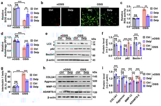 We delved deeper into the effects of Delp therapy on OSIS in hNPCs, particularly focusing on its influence on cellular responses related to oxidative stress and autophagy, as well as its impact on IVDD phenotypes. Initially, we examined how Delp affected two crucial aspects of oxidative stress: superoxide dismutase (SOD) activity and reactive oxygen species (ROS) production. SOD serves as a vital antioxidant enzyme, neutralizing superoxide radicals to safeguard cells from oxidative damage. Our findings revealed a decrease in SOD activity in OSIS hNPCs compared to nOSIS conditions (Figure 4a), indicating diminished antioxidant capacity in OSIS cells, rendering them more vulnerable to oxidative damage. Remarkably, treatment with Delp significantly enhanced SOD activity in OSIS hNPCs (Figure 4a), suggesting an augmentation in the cells’ ability to neutralize superoxide radicals, potentially mitigating oxidative stress-induced damage. Moreover, we observed ROS overproduction in OSIS hNPCs compared to nOSIS conditions (Figure 4b,c), a hallmark of oxidative stress. Notably, Delp treatment markedly attenuated ROS overproduction in OSIS hNPCs, indicating its potential to alleviate oxidative stress by reducing excessive ROS generation within the cells.