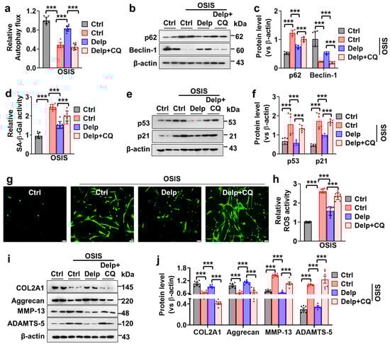 To confirm the involvement of autophagy in cellular senescence and extracellular matrix (ECM) degradation in OSIS hNPCs, we employed chloroquine (CQ), a known autophagy inhibitor, to block the autophagic process and observe its effects on Delp-mediated autophagy activation and associated protein expression. Initially, Delp treatment activated autophagy in OSIS hNPCs, as evidenced by increased expression of key autophagy-related proteins such as Beclin-1, alongside decrease of p62 protein (Figure 5a–c). This indicates that Delp effectively induced autophagy in OSIS hNPCs, potentially contributing to cellular protection against oxidative stress and senescence. Subsequently, co-treatment of OSIS hNPCs with CQ abolished Delp-mediated autophagy activation, as evidenced by a significant reduction in the expression of Beclin-1 and the increased level of p62 protein (Figure 5a–c), suggesting that CQ effectively inhibited the autophagic process initiated by Delp, leading to the accumulation of autophagy-related proteins and disruption of autophagic flux.