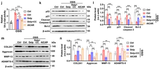 Based on our findings, it appears that treatment with chloroquine (CQ) reduces the autophagy induced by Delp in OSIS hNPCs, suggesting the crucial role of Delp-induced autophagy in its protective effect. We further explored the potential mechanisms underlying the autophagy-inducing effect of Delp in OSIS hNPCs. AMPK is recognized for its role in governing protective autophagy, enabling cells to counteract diverse stressors. By phosphorylating autophagy-related protein complexes, AMPK actively promotes autophagy across various regulatory stages. We hypothesized that Delp triggers autophagy in OSIS cells through activation of the AMPK signaling pathway. To investigate this hypothesis, we utilized compound C (CC), a potential inhibitor of AMPK, and AICAR, an analog of AMPK. As expected, like AICAR, Delp remarkably activated phosphorylated AMPK (p-AMPK) and SIRT1 proteins, while reducing phosphorylated mTOR (p-mTOR) protein expression in the OSIS hNPCs model (Figure 6a–d). Furthermore, Delp-mediated SIRT1/AMPK-mTOR activation was negated by CC treatment. Notably, the induction of autophagy by Delp was significantly diminished with CC treatment, evidenced by decreased levels of LC3-I/II and Beclin-1, along with elevated p62 protein expression in OSIS hNPCs (Figure 6e–g). These results strongly suggest that Delp-induced AMPK activation leads to autophagy activation in OSIS hNPCs. Moreover, our data revealed that AMPK activation by either AICAR or Delp notably reduced the overproduction of reactive oxygen species (ROS), whereas CC treatment increased ROS production suppressed by Delp (Figure 6h,i). Moreover, inhibition of the AMPK signaling pathway by CC markedly induced the attenuation of SA-β-gal activity in OSIS hNPCs (Figure 6j). Correspondingly, Western blot data indicated that CC treatment reversed the effects of Delp on the expression of senescence proteins p53 and p21 in the OSIS model (Figure 6j,k). Additionally, the Western blot analysis of IVDD candidate proteins showed significant reductions in COL2A1 and Aggrecan in the Delp plus CC-treated group, alongside increases in MMP-13 and ADAMTS-5 (Figure 6l,m). These findings underscore the critical role of AMPK signaling in mediating the effects of Delp on autophagy, ROS production, and senescence in OSIS hNPCs, highlighting its potential as a therapeutic target for IVDD. Taken together, our findings indicate that Delp activates autophagy through AMPK and reduces oxidative stress-induced senescence and IVDD phenotypes.