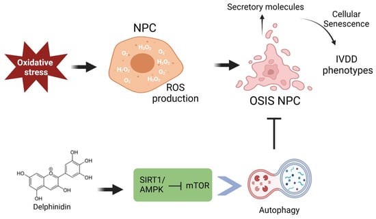 Our study demonstrated that Delp exerts antioxidant effects by mitigating ROS-induced oxidative stress and cellular senescence in human IVD NPC cells. Moreover, Delp simultaneously induces autophagy, fostering cell growth and ECM synthesis while suppressing ROS overproduction and cellular senescence. Inhibition of autophagy using CQ in hNPCs diminished the protective effect of Delphinidin on ROS overproduction, cellular senescence, and ECM degradation. This protective autophagy induction by Delp is mediated via the activation of the SIRT1/AMPK-mTOR signaling pathway in hNPCs.