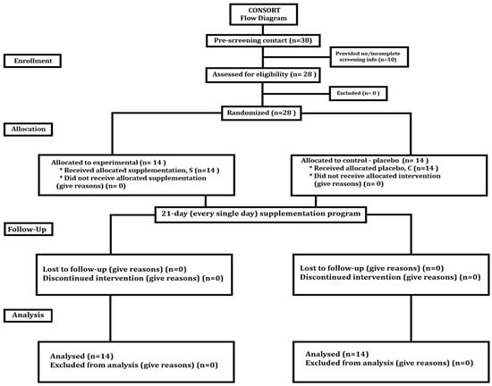 The participants took no drugs during the study or in the three months preceding it and were provided with a list of foods rich in CoQ10 that could not be eaten during the experiment. Prior to the start of the study, a medical practitioner examined all participants. They were informed about the study procedures before enrolment but were unaware of the study aims or the supplementation schedule. The runners were randomly assigned to two groups: an experimental (supplementation, S; n = 14, age 20.11 ± 1.12 years) and a control (placebo, C; n = 14, age 20.32 ± 1.57 years).