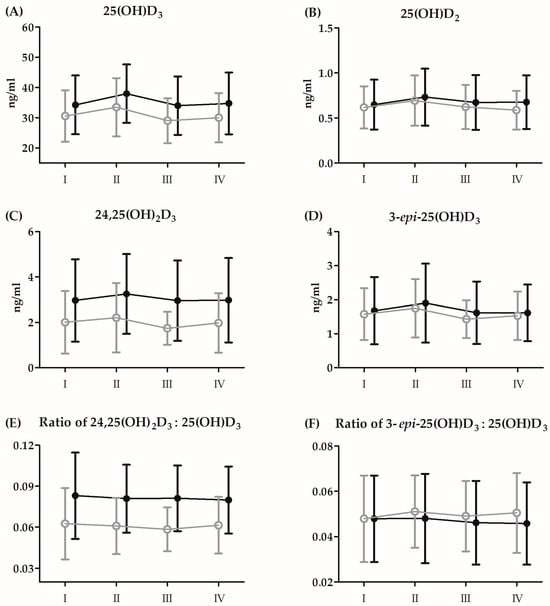 Changes in serum levels of vitamin D metabolites induced by Bruce protocol treadmill test (BTT) before 21 days of supplementation with CoQ10 (mean ± SD). (A) 25(OH)D3, 25-hydroxyvitamin D3; (B) 25(OH)D2, 25-hydroxyvitamin D2; (C) 24,25(OH)2D3, 24,25-dihydroxyvitamin D3; (D) 3-epi-25(OH)D3, 3-epi-25-hydroxyvitamin D3; (E) Ratio 24,25(OH)2D3:25(OH)D3, 24,25-dihydroxyvitamin D3:25-hydroxyvitamin D3; (F) Ratio 3-epi-25(OH)D3:25(OH)D3, 3-epi-25-hydroxyvitamin:25-hydroxyvitamin D3. Black circles, supplementation group (n = 14); grey circles, placebo group (n = 14): I, baseline; II, immediately after BTT; III, 3 h after BTT; IV, 24 h after BTT.
