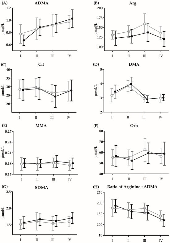 Changes in serum levels of amino acid metabolites induced by Bruce protocol treadmill test (BTT) before 21 days of supplementation with CoQ10 (means ± SD). (A) asymmetric dimethylarginine (ADMA); (B) arginine (Arg); (C) citrulline (Cit); (D) dimethylamine (DMA); (E) methylarginine (MMA); (F) ornithine (Orn); (G) symmetric dimethylarginine (SDMA); (H) ratio of arginine:ADMA. Black circles, supplementation group (n = 14); grey circles, placebo group (n = 14): I, baseline; II, immediately after BTT; III, 3 h after BTT; IV, 24 h after BTT.