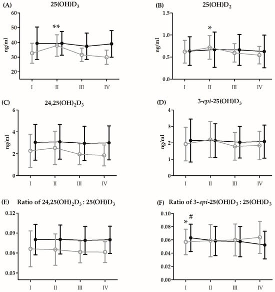 Changes in serum levels of vitamin D metabolites induced by Bruce protocol treadmill test (BTT) after 21 days of supplementation with coenzyme Q10 (means and standard deviations). (A) 25(OH)D3, 25-hydroxyvitamin D3; (B) 25(OH)D2, 25-hydroxyvitamin D2; (C) 24,25(OH)2D3, 24,25-dihydroxyvitamin D3; (D) 3-epi-25(OH)D3, 3-epi-25-hydroxyvitamin D3 (E) Ratio 24,25(OH)2 D3:25(OH)D3, 24,25-dihydroxyvitamin D3:25-hydroxyvitamin D3; (F) Ratio 3-epi-25(OH)D3:25(OH)D3, 3-epi-25-hydroxyvitamin D3:25-hydroxyvitamin D3. Black circles, supplemented group (n = 14); grey circles, placebo (n = 14). I, resting; II, immediately after BTT; III, 3 h post BTT; IV, 24 h post BTT; * significant difference vs. placebo group in IV time point at p < 0.05; ** significant difference vs. placebo group in I, III and IV time point at p < 0.01; # significant difference vs. CoQ10 group in IV time point at p < 0.05.