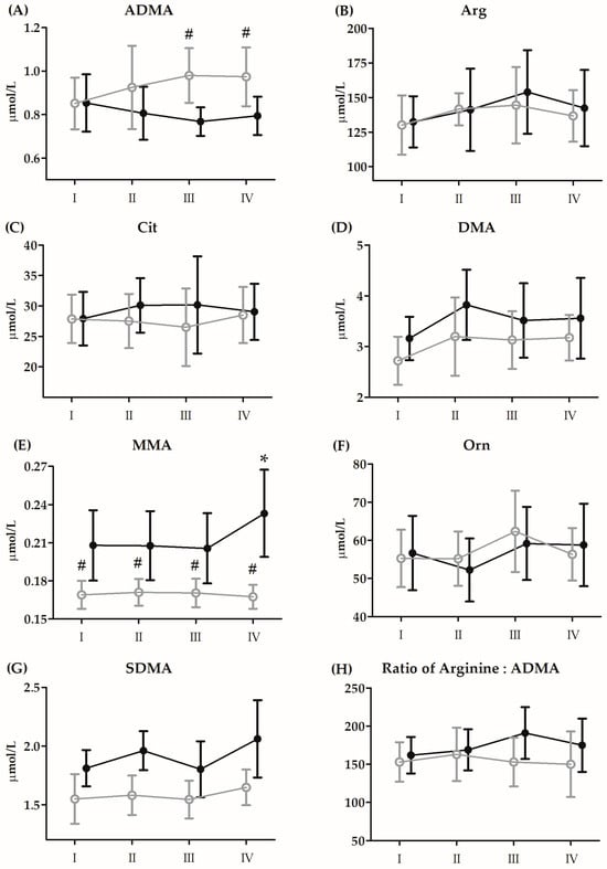 Changes in serum levels of amino acid metabolites induced by Bruce protocol treadmill test (BTT) after 21 days of supplementation with coenzyme Q10 (means and standard deviations). (A) asymmetric dimethylarginine (ADMA); (B) arginine (Arg); (C) citrulline (Cit); (D) dimethylamine (DMA); (E) methylarginine (MMA); (F) ornithine (Orn); (G) symmetric dimethylarginine (SDMA); (H) ratio of arginine:ADMA. Black circles, supplemented group (n = 14); grey circles, placebo (n = 14). I, resting; II, immediately after BTT; III, 3 h post BTT; IV, 24 h post BTT; * significant difference vs. supplemented group in all timepoints at p < 0.01; # significant difference vs. supplemented group at p < 0.01.