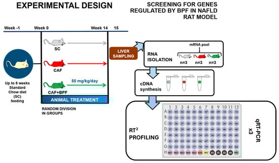 The experimental design and screening for genes regulated by BPF in NAFLD rat model in this work: rat division for dietetic treatment and BPF administration for 15 weeks. On the right side, a flow description is exhibited, from the liver sampling to RT2 profiling.