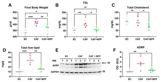 Bergamot polyphenols prevent CAF diet-induced obesity, hypertriglyceridemia and intracellular fat accumulation in Wistar rats. (A) Final body weight, (B) blood triglycerides, (TGL) (C) blood total cholesterol. Data are presented as the mean ± SD of n = 5 rats. Each dot represents a rat. (D) The total lipid content in 400 mg of liver tissue was determined by Folch’s method. Data are presented as the mean ± SD of n = 4 livers for each group. (E) Representative blots for ADRP/Perilipin 2 and GAPDH as a loading control, showing liver lysates from 3 different rats for each group. (F) OD ratio of ADRP to GAPDH expression levels. Data are expressed as the mean ± SEM of n = 6 rat liver lysates for each group. Statistical analysis in (A–D,F): one-way ANOVA with Tukey’s post-test, * p ≤ 0.05, ** p ≤ 0.01, *** p ≤ 0.001, ns—not significant change.