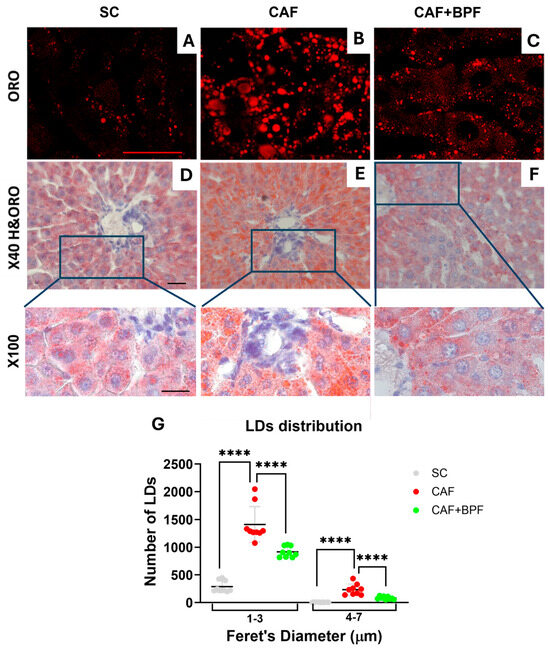This technique revealed the accumulation of numerous, considerably larger LDs in hepatocytes of CAF-fed rats (Figure 3B) compared to SC-fed rats (Figure 3A). BPF supplementation strongly attenuated hepatic LDs accumulation (Figure 3C). These observations were confirmed by the analysis of the numbers and size of lipid droplets (LD) in oil red stained liver sections (Figure 3G). Hematoxylin staining revealed important differences in liver histology: in SC and groups, liver parenchyma appeared homogeneous, and the hepatocytes showed uniform size with large, rounded nuclei usually located in the center of the cells and cytoplasmic glycogen granules, with few LDs (Figure 3D). In contrast, the cytoplasm of CAF hepatocytes appeared highly vacuolated, rich in both glycogen granules and LDs (Figure 3E). Importantly, CAF + BPF livers resembled SC with moderately increased oil red staining (Figure 3F).