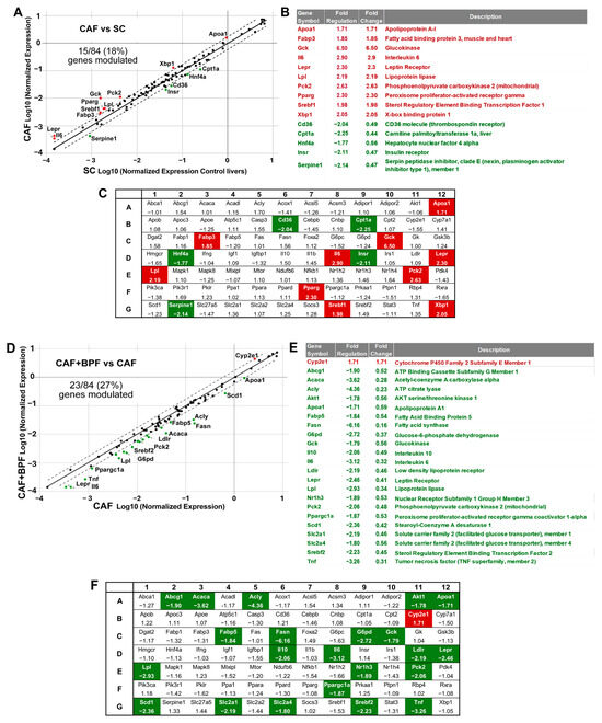 Differential expression of fatty liver-related transcripts in steatotic livers exposed to CAF diet for 14 weeks as compared to control SC diet (A–C) and the effects of a chronic supplementation of bergamot polyphenols to CAF diet in rats (D–F). (A) CAF vs. SC and (D) CAF + BPF vs. CAF scatter plots for differential expression analysis of 84 fatty liver genes. Below, the lists of genes modulated more than 1.7-fold when CAF livers are compared to SC livers (B) and CAF + BPF (E) are compared to CAF livers. (B,D) The arrays of all fatty liver-associated genes with respective fold regulation values when (C) CAF vs. SC and (F) CAF + BPF vs. CAF livers are compared. Note that bergamot polyphenols strongly suppress lipogenesis-related genes in the liver.