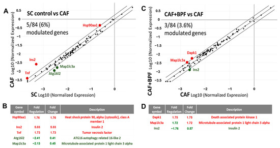 Differential expression of autophagy-related transcripts in steatotic livers exposed to CAF diet for 14 weeks as compared to control SC diet (A,B) and the effects of chronic supplementation of bergamot polyphenols to CAF diet in rats (C,D). (A) CAF vs. SC and (C) CAF + BPF vs. CAF scatter plots for differential analysis of 84 autophagy genes. (B,D) Below, the lists of genes modulated more than 1.7-fold when CAF livers are compared to SC livers (B) and CAF + BPF are compared to CAF livers (D). Note that CAF diet and bergamot polyphenols have a very modest effect on the expression of autophagy-related genes.